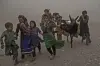 NATURKATASTROFE: Afghanere strever seg gjennom en sandstorm for å motta nødhjelp etter det katastrofale jordskjelvet i Zenda Jan i Herat-provinsen i Afghanistan i starten av oktober. Over tusen mennesker mistet livet i naturkatastrofen, som inntraff på samme tidspunkt som krigsutbruddet mellom Israel og Hamas. Foto: Ebrahim Noroozi / AP / NTB