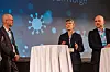 Fridtjof Heyerdahl, overlege i anestesiologi ved Luftambulanseavdelingen ved Oslo universitetssykehus, samfunnsmedisiner, kommuneoverlege og virksomhetesleder i Nordre Follo kommune, Kerstin Anine Johnsen Myhrvold, og Bjørn Sletvold, medisinsk fagsjef i byrådsavdeling for helse, Oslo kommune, delta av sine opplevelser av å stå i første linje da pandemien traff Norge.Foto: Tone Herregården