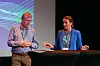 POSITIV: Ingrid Stenstadvold Ross i Kreftforeningen er avbildet på DM Arena Kreftkonferansen 2024 i panelsamtale med fagdirektør Andreas Stensvold ved Sykehuset Østfold.